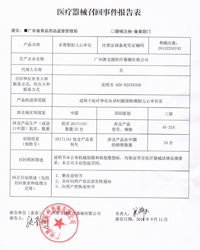 广州澳戈健医疗器械有限公司报告,该公司生产的多普勒胎儿心率仪经检验,不符合标准规定。广州澳戈健医疗器械有限公司主动召回有关产品,召回级别为三级。涉及产品的型号、规格及批次等详细信息见《医疗器械召回事件报告表》。