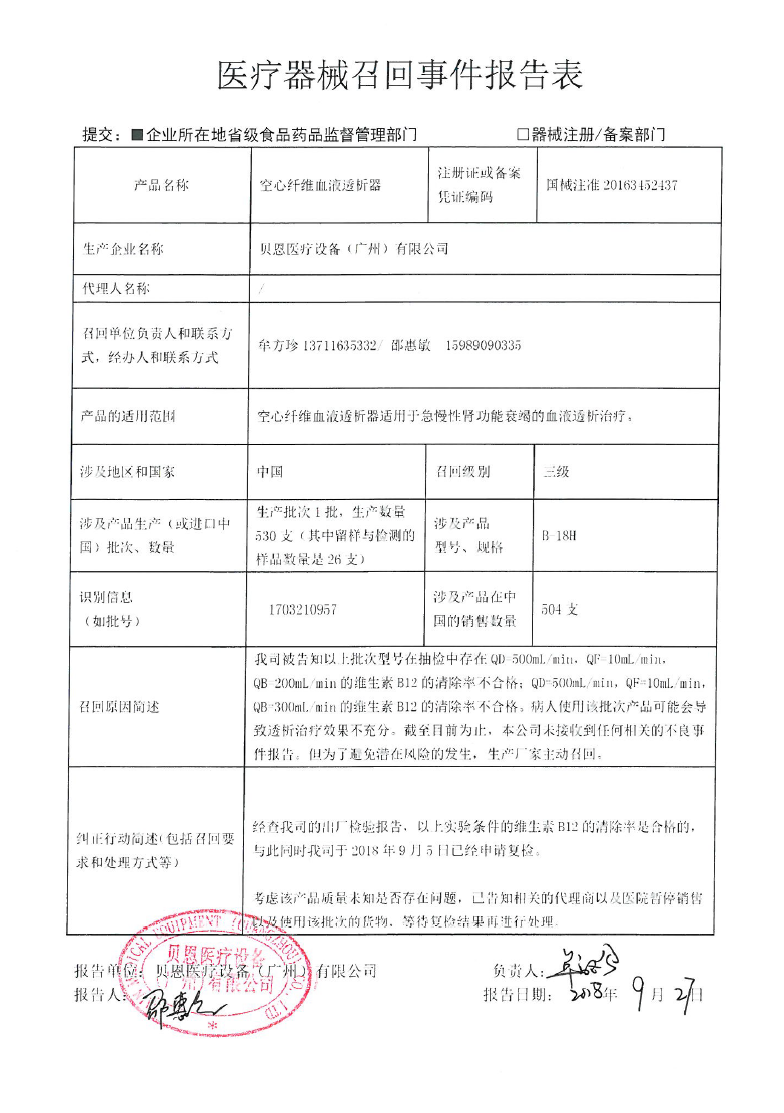 贝恩医疗设备(广州)有限公司报告,该公司生产的空心纤维血液透析器经检验,不符合标准规定。贝恩医疗设备(广州)有限公司主动召回有关产品,召回级别为三级。涉及产品的型号、规格及批次等详细信息见《医疗器械召回事件报告表》。